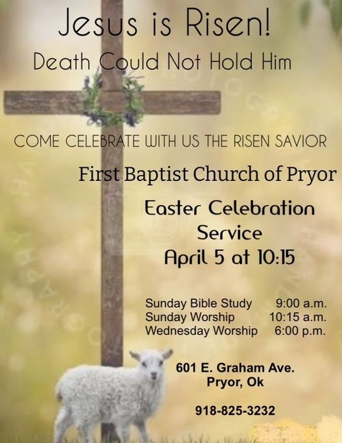 Thanks for checking out First Baptist Church of Pryor Online! We're glad you are here and hope you find our information and resources on this website helpful and useful!